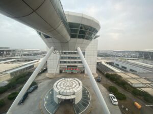As we arrived late, we had no choice of rooms but the staff did try to help. Four of the rooms (8743, 8745, 8758 & 8760) in the South wing, faced North towards the closed walkway that used to connect the North & South Wings. This gave views of departures to the North as they came off runways 34L/34R & 35L/35R, but you couldn’t see any arrivals. When we checked back in two days later, we were earlier and so was able to request rooms 8800, 8801, 8802 & 8806 which are in the South facing bit of the South wing. From those you can see all arrivals on runways 34L/34R & 35L/35R and some departures if they climbed quickly enough. If the wind direction changes, you’d see all departures instead. I booked “Superior standard room (south)” through trip.com. You need level 7 or 8 to be able to see over the terminal buildings…..